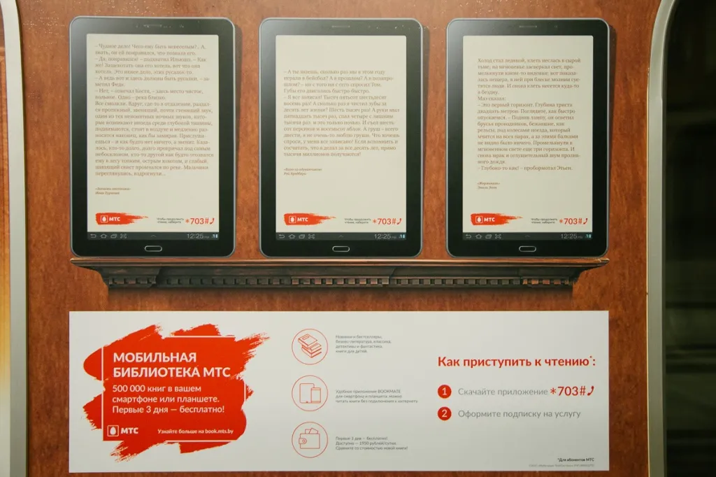 Кроме этого, немногим ранее по инициативе МТС в минском метро начала работу «Мобильная библиотека», также призванная повысить среди белорусов интерес к чтению. Помимо прочего проект позволяет бесплатно (в течение трех дней) опробовать мобильное приложение Bookmate для устройств под управлением iOS и Android, которое открывает доступ более чем к 500 000 художественных и прикладных книг.