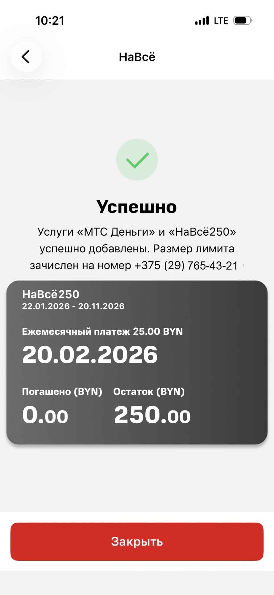 - Подключение услуги «НаВсё250» доступно при успешном прохождении процедуры предварительной оценки платежеспособности;