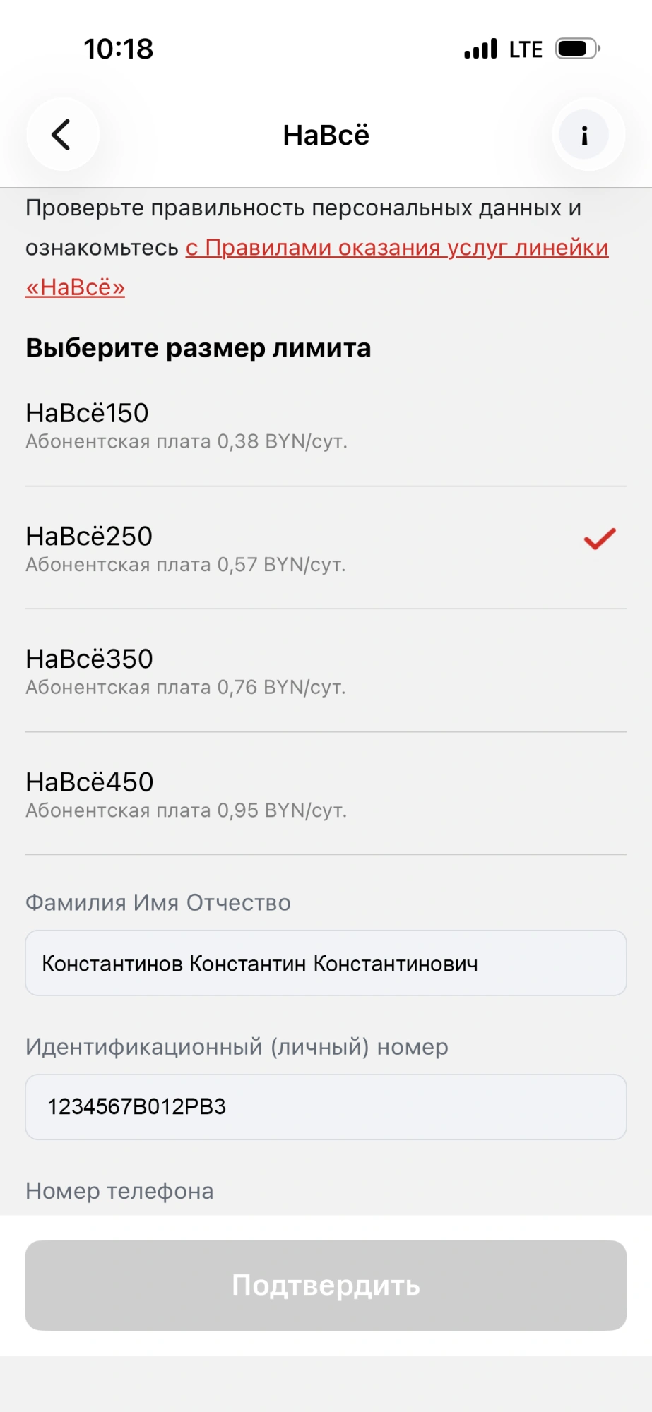 - Выберите размер лимита, который хотите подключить, ознакомьтесь с Правилами оказания услуг "НаВсё" и подтвердите согласие.
