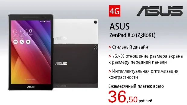 Полная стоимость ASUS ZenPad 8.0 в рамках акции «Планшеты к лету» – 369,90 рублей / 3 699 000 рублей. При оформлении планшета в рассрочку на год первоначальный взнос составляет 46,90 рубля / 469 000 рублей, а ежемесячный платеж – 36,50 рублей / 365 000 рублей. За покупку модели МТС дарит 3 месяца бесплатного пользования услугой «Интернет Mini».