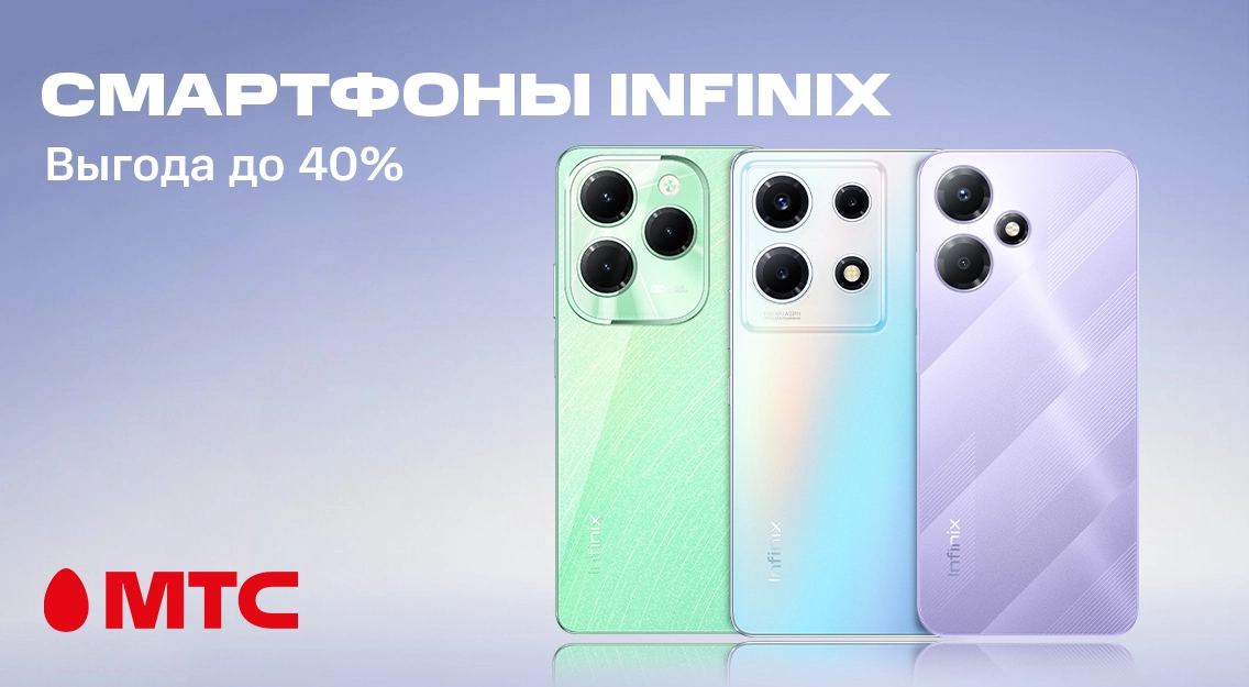Покупайте выгодно в МТС! В МТС представлен большой выбор девайсов Infinix. Более десяти моделей смартфонов доступны со скидкой до 40%. Приобрести их можно в рассрочку до 24 месяцев без первого платежа.